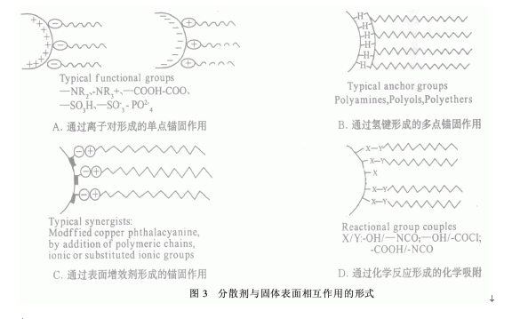 分散劑在分散相上的吸附是其顯示潤濕分散性能的前提。在非水體系中,錨固端一般在顆粒的表面形成吸附(如圖2所示),它與顆粒的相互作用與錨固基團的種類和粒子的表面性質(zhì)有關(如圖3A-D)