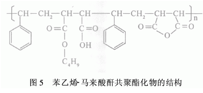 應用于水性體系的超分散劑的報道很少。苯乙烯-馬來酸酐共聚物(SMA)是近年來研究較多的聚合物,因其含有可與顏料分子平面形成強π-π鍵的苯環(huán),及水解后可形成溶劑化鏈并提供空間位阻的馬來酸,故可用于水性顏料體系。不同用途的SMA結構、分子量各不相同,制備方法也有所差別。如徐燕莉等人先用苯乙烯和馬來酸酐為單體采用懸浮聚合合成共聚物,再以丁醇為酯化劑將其酯化,發(fā)現(xiàn)該類共聚酯化物對酞菁藍顏料在水介質(zhì)中的分散性能有較大的提高,能有效地改善酞菁藍顏料的潤濕性、流動性和在水中的分散穩(wěn)定性,其結構如圖5所示。